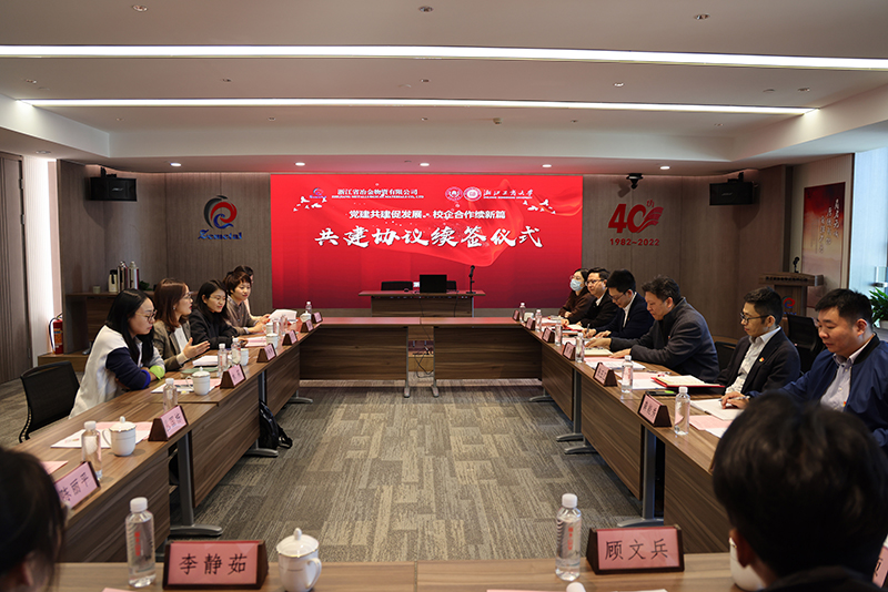 11月20日,浙江省冶金物資有限公司與浙江工商大學工商管理學院開展共建活動,續簽支部共建協議。冶金物資黨委書記、董事長鄭浩出席活動,見證簽約儀式。黨委副書記、紀委書記陳建,黨委委員、副總經理張王乙,第二黨支部書記、鋁事業部開發部經理江濤,辦公室副主任、紀委辦公室主任兼黨群工作部主任龔能秀;工商管理學院MBA教育中心執行主任胡瑋瑋,系主任、學院國際中心主任林莉,國商系與行政教師黨支部書記、副系主任張月月及雙方相關人員參加活動。