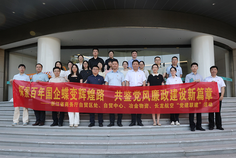 7月23日,浙江省商務廳自貿區處、浙江省自由貿易發展中心、浙江長龍航空有限公司、浙江省冶金物資有限公司四方開展黨建聯建交流學習。省商務廳自貿區處處長駱林勇,省自由貿易發展中心主任陳巧艷,冶金物資黨委副書記、紀委書記、監事會主席陳建,長龍航空機關黨支部書記、總監徐文龍等參加活動。